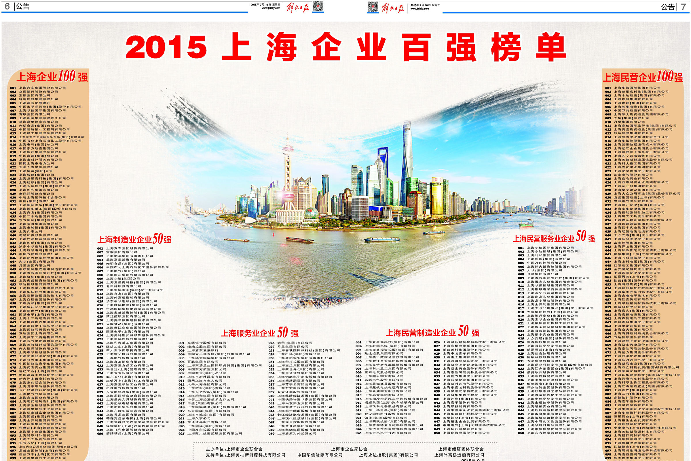 2015上海企業(yè)100強(qiáng)排行榜由市企業(yè)聯(lián)合會、市企業(yè)家聯(lián)合會和市經(jīng)濟(jì)團(tuán)體聯(lián)合會于2015年9月15日共同發(fā)布,長江聯(lián)合集團(tuán)列81位。(行政辦公室供稿)