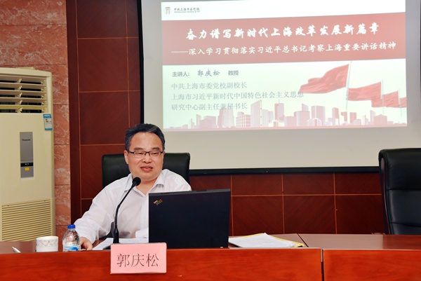 郭慶松教授圍繞主題,從“以講話精神統(tǒng)一全市上下思想和行動、以‘六個緊緊圍繞’推動講話精神落地”、以‘充滿激情’奮力創(chuàng)造新時代上海傳奇”三個方面深入解讀了習近平總書記在上??疾鞎r提出的“為全國改革發(fā)展大局服務、推動經(jīng)濟高質量發(fā)展、推動改革開放向縱深發(fā)展、深化社會治理創(chuàng)新、提高黨的建設質量和水平”五個方面的工作要求,具體講解了上海市委、市府在學習貫徹落實和推動講話精神落地的具體要求和工作部署。報告深入淺出、形象生動,既有理論上的解讀,又緊密聯(lián)系實際,運用大量的事例、案例進行說明,闡釋了習近平總書記考察上海重要講話精神。